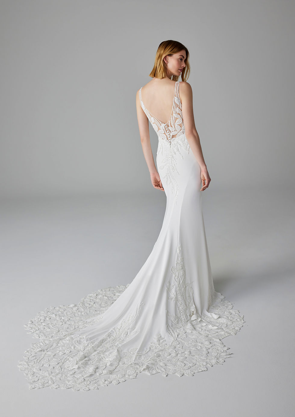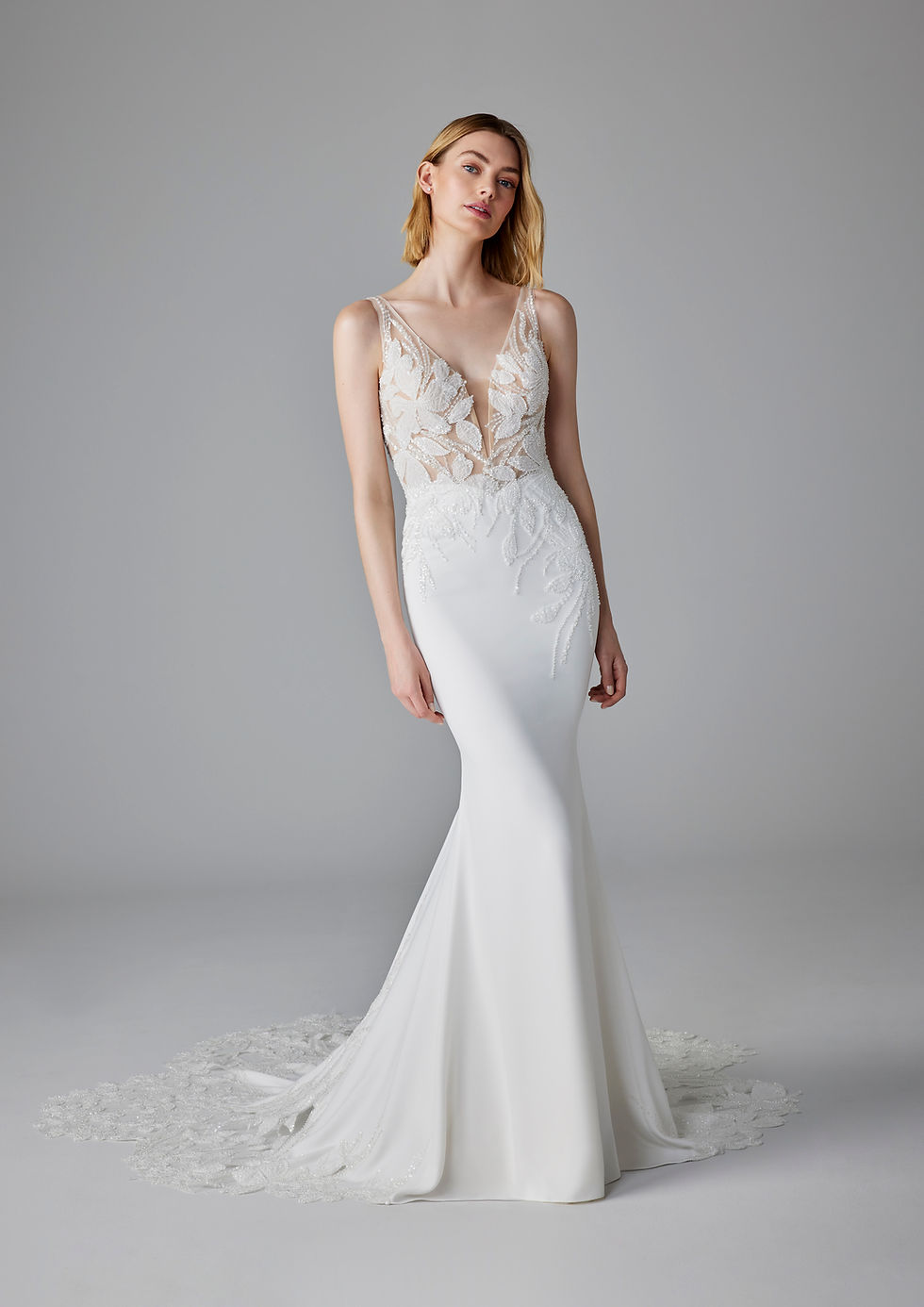 Su estilo favorecedor, sofisticado y femenino abraza la figura, mientras que la cola de su falda fluye contigo a cada paso. Saca la sirena que llevas dentro con un modelo de encaje, crepe o mikado y fabulosos detalles que te harán lucir una verdadera novia de ensueño.